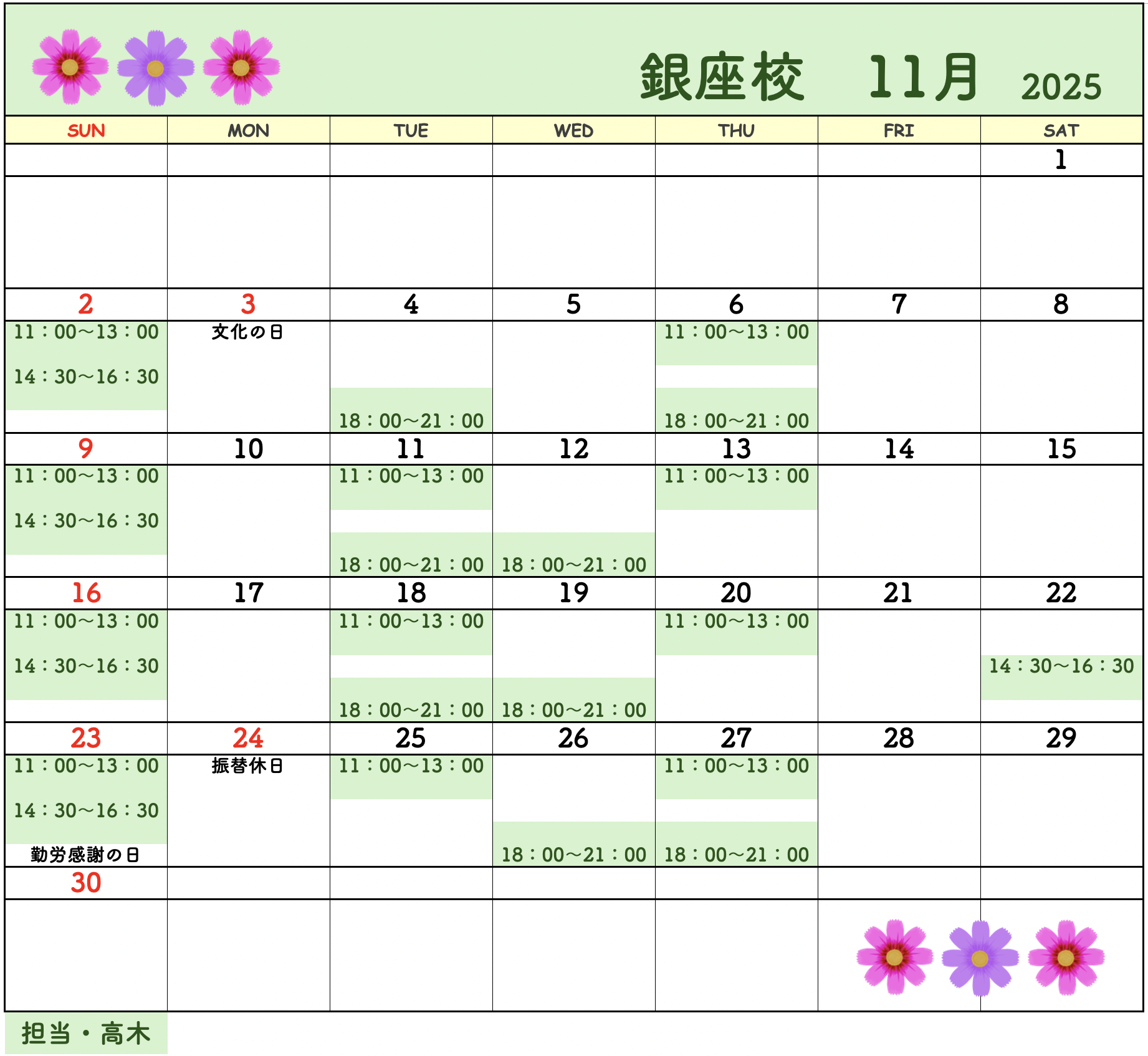 銀座校の【日曜】の時間帯は現在満席となっております。