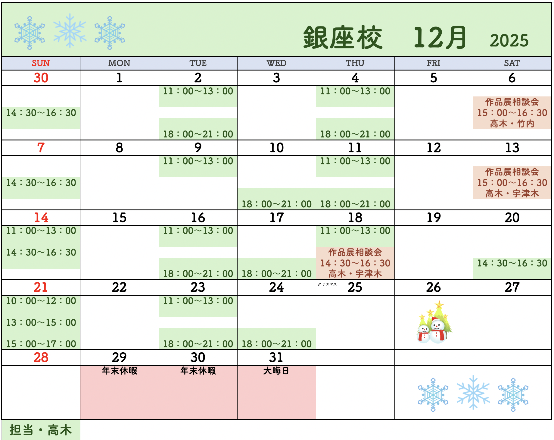 【2025年11月・12月】書道教室銀座校のカレンダー