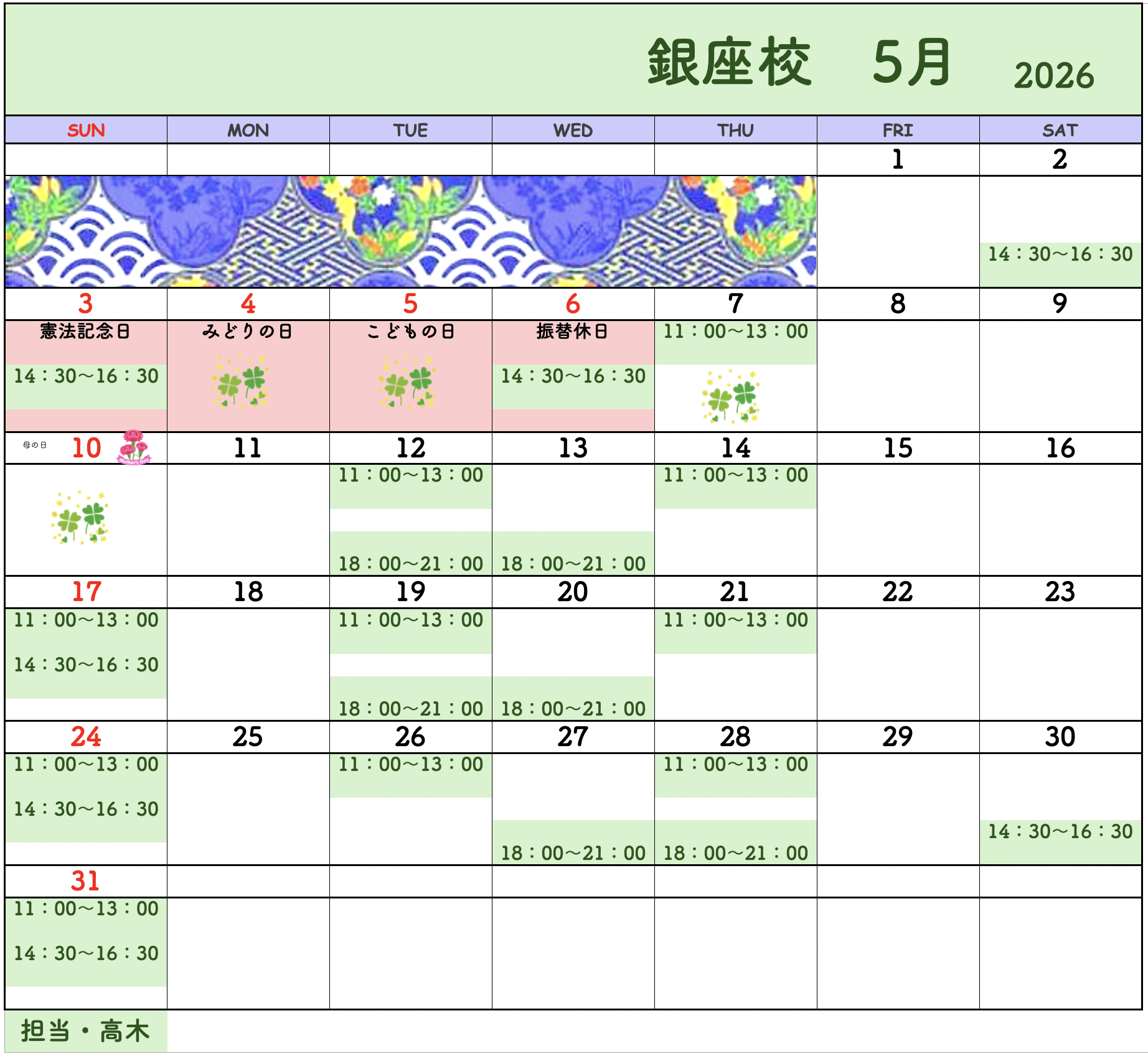 【2026年4月・5月】書道教室銀座校のカレンダー