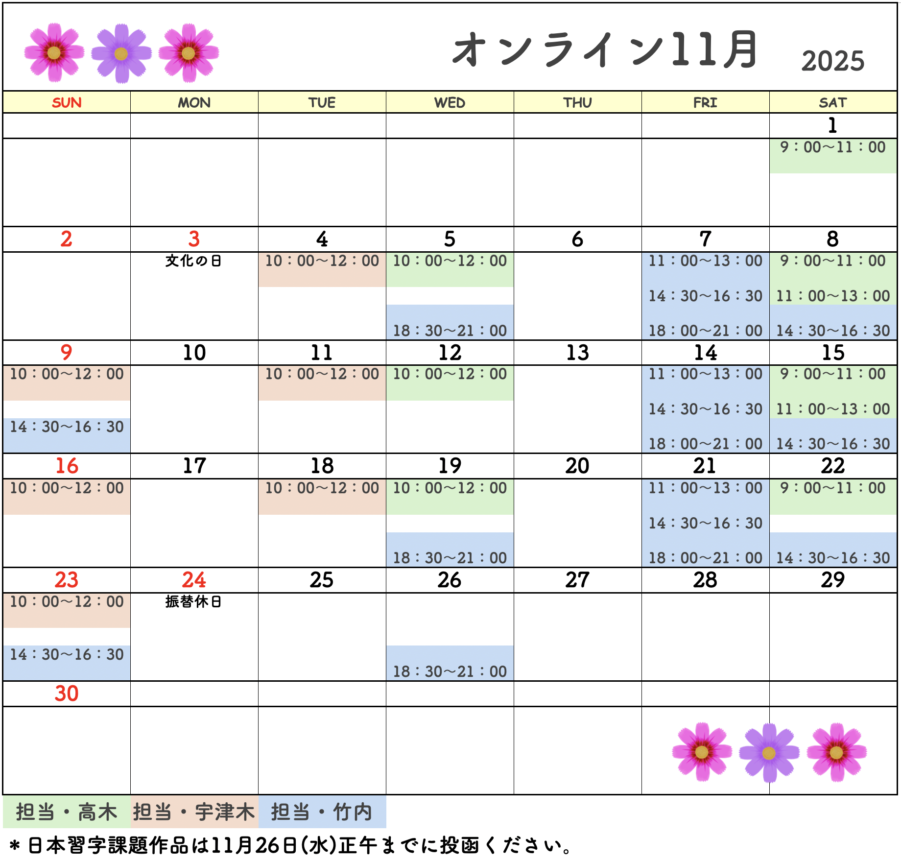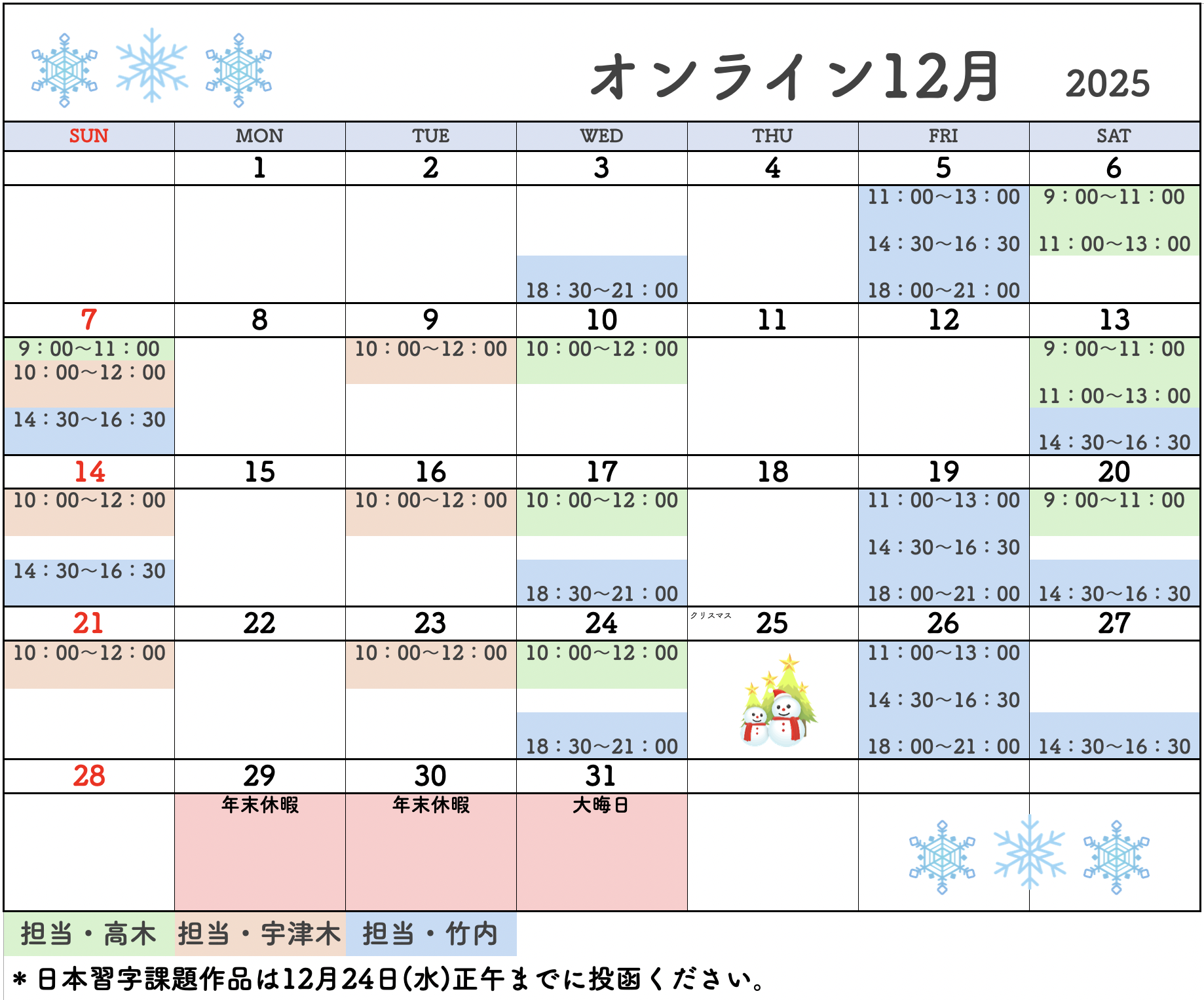 【2025年11月・12月】書道教室オンラインのカレンダー