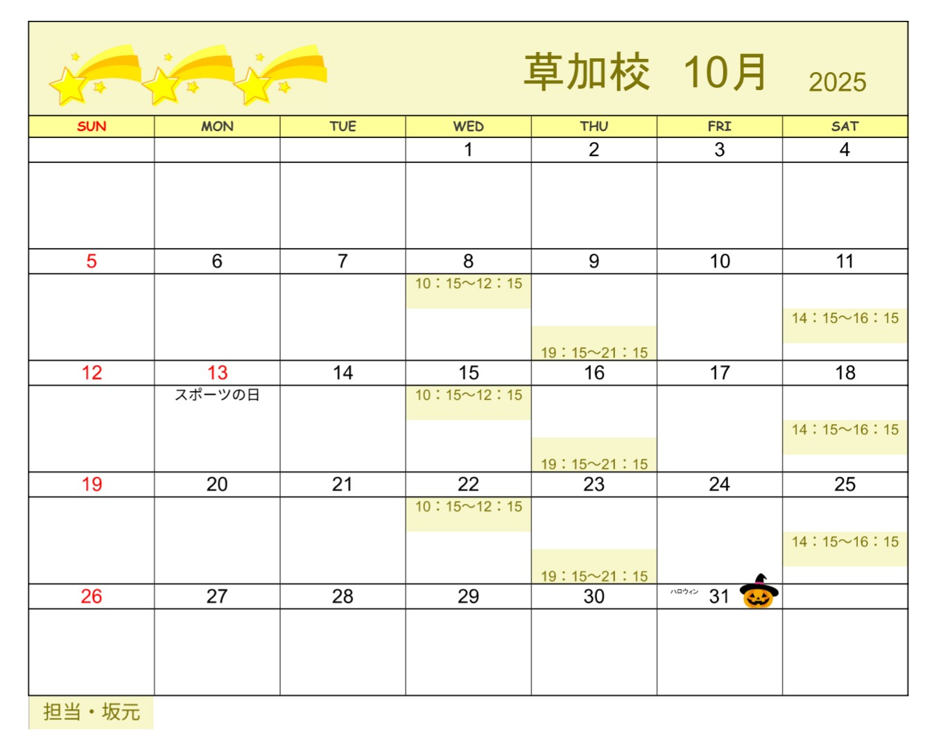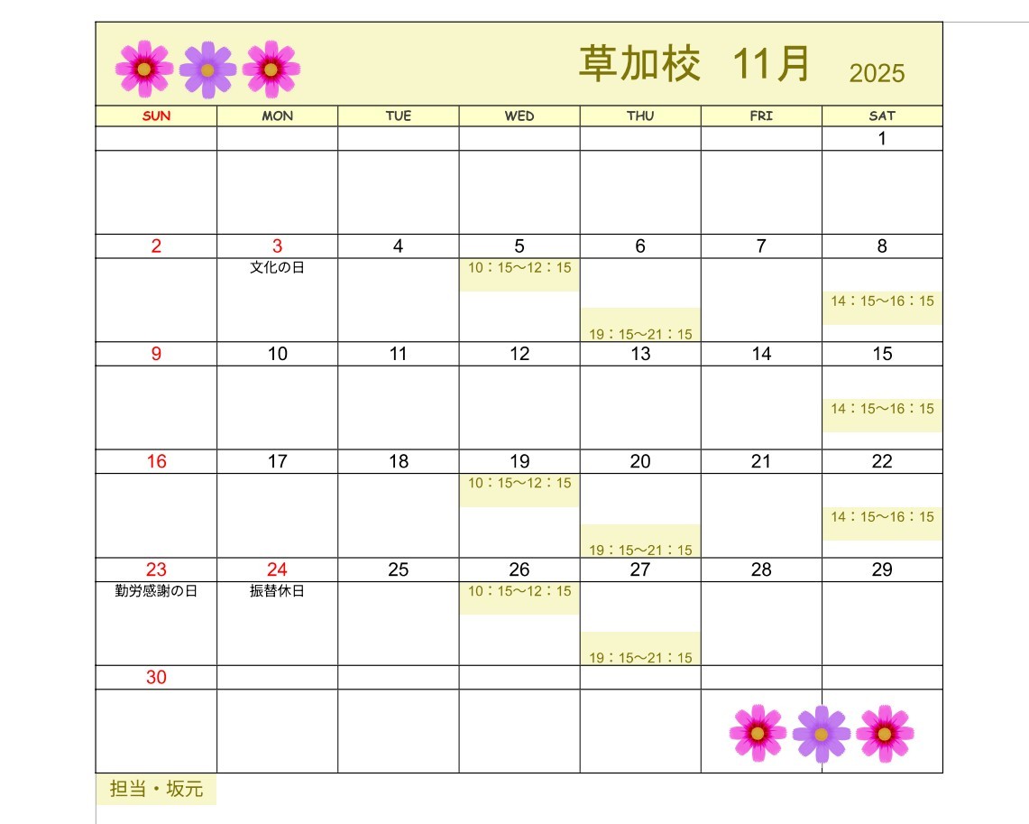 【2025年10月・11月】書道教室草加校のカレンダー