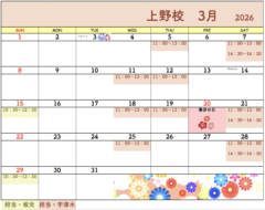 【2026年2月・3月】書道教室銀座校のカレンダー